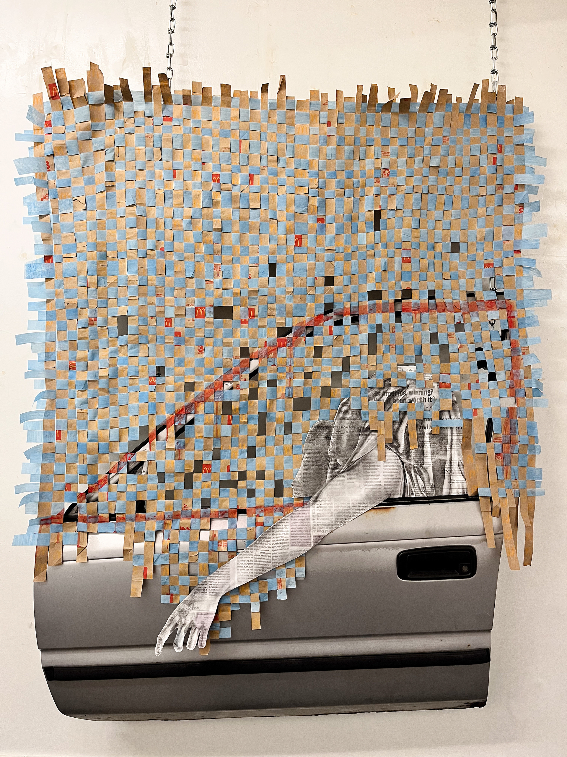 This self-portrait is a meditation on loss. In it, I’ve recreated a striking childhood memory: one summer day in my hometown in Colorado, I saw a grayish-blue man draped out of the driver’s seat window from his car in a McDonald’s parking lot. He had apparently passed away, presumably from an overdose. Someone had tossed an oily rag to cover his face. My mom and I drove past in a funeral procession of shoppers with our weekly grocery haul. The drive-thru of the restaurant was still open and busy.