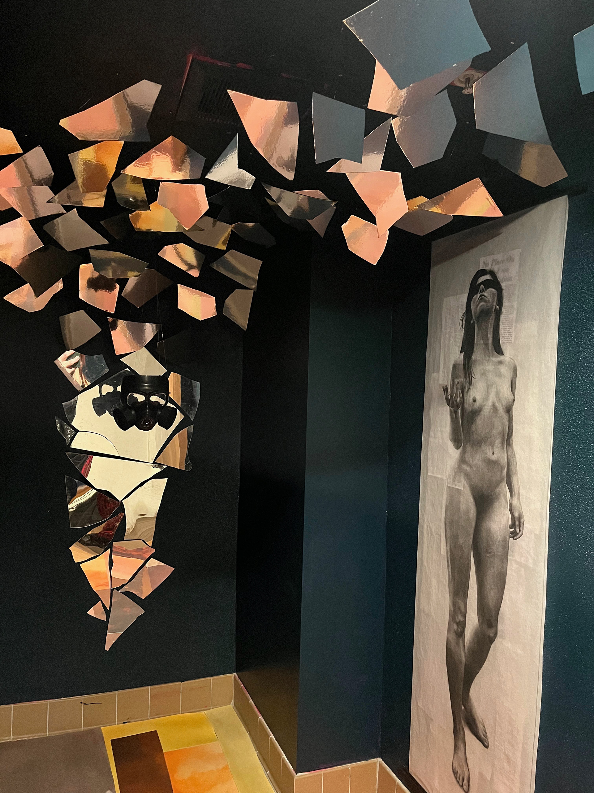 7’0 x 4’9” x 8’8” | 2023 | Mixed media installation: cut paper, chalk pastel, and charcoal drawings, found objects, MP5 gas mask